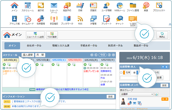 組織のコミュニケーションを円滑にし情報共有を促進することができます。 直感でわかりやすい操作性、「機能のON/OFF」「ユーザ・グループ毎のアクセス権限」など管理者に優しい柔軟な設定、日本企業の文化に合わせた細かな機能は純国産ならではです。